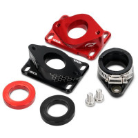 Dieser CNC gefräste und farbig eloxierte Ansaugstutzen von Voca Racing ist für die Montage von großen PWK Vergasern von Ø21er bis Ø28er gemacht.