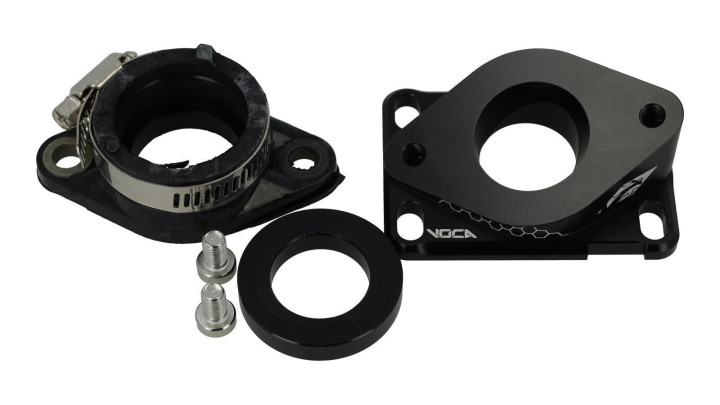 Dieser CNC gefräste und farbig eloxierte Ansaugstutzen von Voca Racing ist für die Montage von großen PWK Vergasern von Ø21er bis Ø28er gemacht.