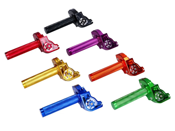 Kurzhub Gasgriff aus Aluminium, in verschiedenen Farben eloxiert. Passend für Standard Motorradlenker mit 22mm Durchmesser.