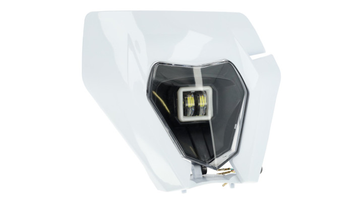 Diese universelle LED-Frontmaske im KTM-Stil kombiniert modernes Design mit leistungsstarker LED-Technik und eignet sich für den Einsatz an verschiedensten Enduro-, Supermoto- und Offroad-Motorrädern. Das kantige Erscheinungsbild orientiert sich optisch an aktuellen KTM-Modellen und verleiht dem Bike eine sportliche, aufgeräumte Front.
