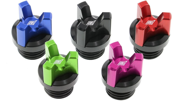 Auffällige Öleinfüllschraube von Radical Racing. Die Öleinfüllschraube ist ein direkt sichtbares und schnell ausgetauschtes Einzelteil, das Optisch einiges hermachen kann. Die komplett CNC gefertigte Schraube besteht aus einem Ober- & Unterteil, dabei wird der untere Teil der Schraube schwarz und der obere Teil farbig eloxiert.